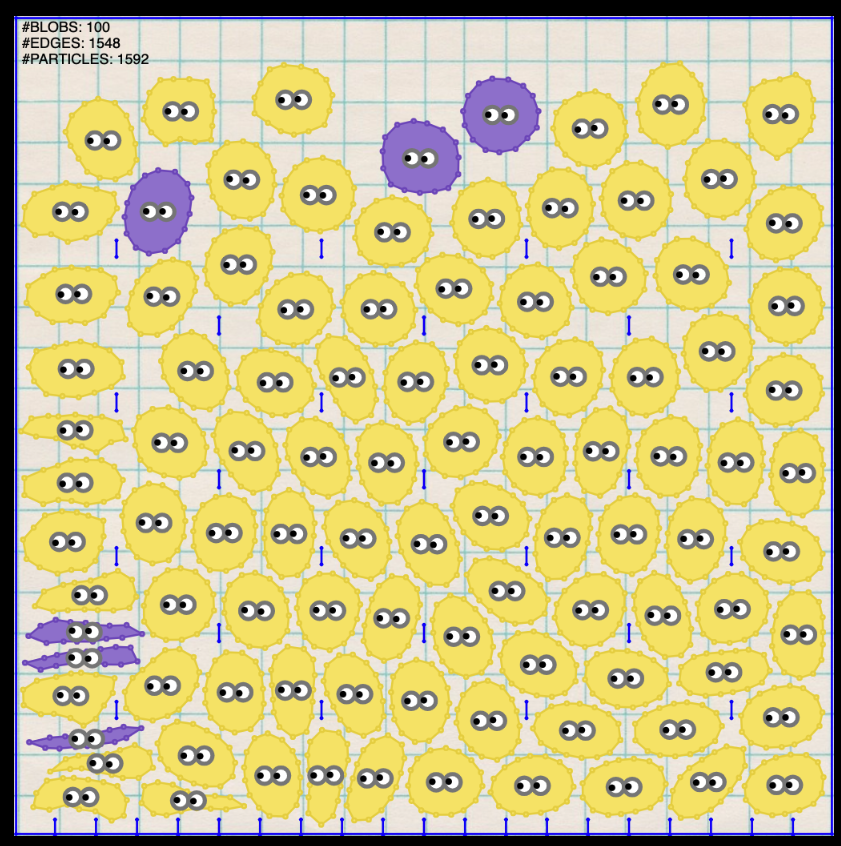 In this assignment, I implemented various forces and collision handling to simulate blob deformation and interactions. The blobs experience stretching forces modeled as springs, with carefully tuned stiffness to maintain stability while preventing excessive stretching. I implemented bending forces based on the angles between connected vertices to encourage a round shape, adjusting the stiffness to balance smoothness and numerical stability. Compression forces were also implemented to maintain the blob’s area during collisions, preventing deflation. For collision detection, I used penalty forces and contact impulses for blob-environment interactions and broad-phase collision detection with AABBs for blob-blob collisions. Additionally, I added expressive features, including minion-like faces with changing colors based on the blob’s area, turning them into purple minions when the area deviates too much from the rest shape. One key challenge involved tuning the bending forces with a non-zero rest angle based on the number of particles, which required adjusting angular correction forces to maintain the blob’s shape and stability.